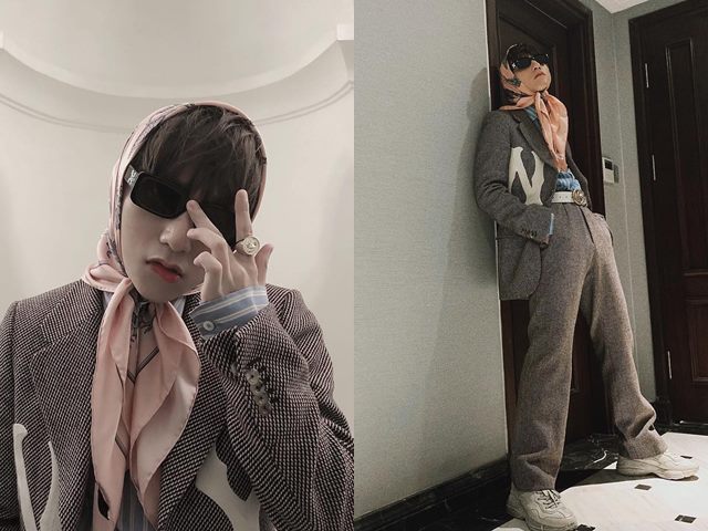 Sơn Tùng mặc suit, đeo kính bịt khăn như bà cụ già nhưng người hâm mộ thích thú vô cùng.