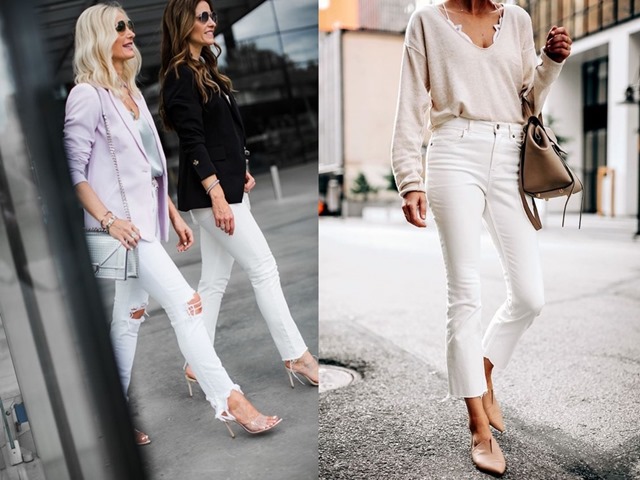 Giày cao gót hoặc có gót vừa phải sẽ làm tăng thêm hiệu quả “hack dáng” khi diện jeans trắng.